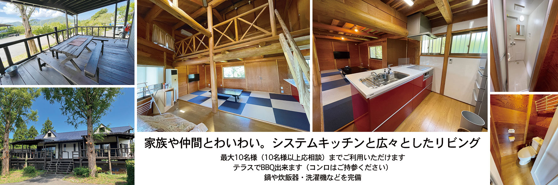 <設備一覧> エアコン・シャワー・トイレ・洗濯機 宿泊人数分寝具 歯ブラシ・手ぬぐい・バスタオル <調理器具一式> ● IHシステムキッチン・冷蔵庫・炊飯器・電子レンジ・湯沸しポット・まな板・包丁 ● 皿(大・中・小 各10枚) ● 鍋(大・中・小 各1個) ● フライパン ● 使い捨てコップ・箸(各10) ※その他必要なものは、お客様自身でご用意くださいませ。 |